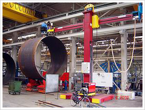 | 焊接操作机(焊接十字架) | 自动焊接操作机(架)结构形式分为:固定式、固定带回转、移动带回转24种组合;横臂和立柱的截面进行科学计算,横臂水平伸缩下垂量2mm/m;横臂的升降装置配有意外防坠落装置,采用棘条棘爪机构,更安全可靠;横臂前端配有十字微调机构,可以在遥控盒上进行操作;导向轮轴为偏心轴,可以方便消除滚轮与导轨之间的间隙;立柱回转分为手动和电动两种形式,回转到位后的锁紧机构也分为手动和气动两种形式;电器部分包括电控箱和遥控盒两部分组成,并留有与变位机和滚轮架的控制接口。